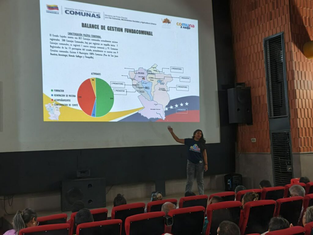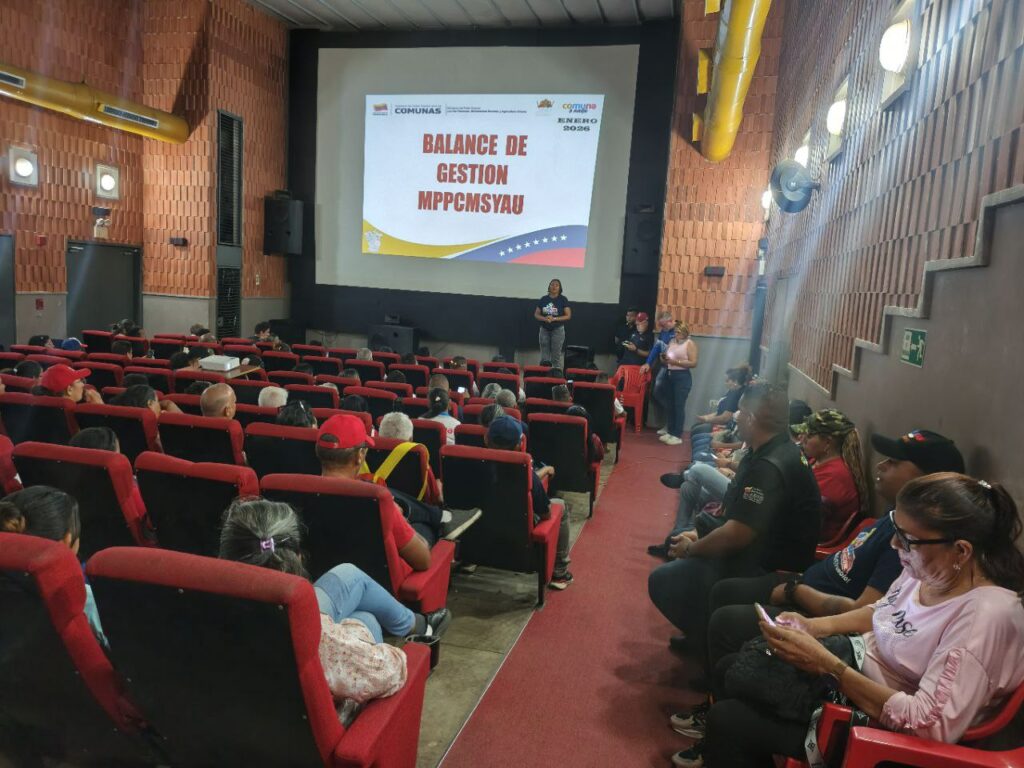 Desde las instalaciones de la Cinemateca ubicada en la ciudad de San Carlos, municipio Ezequiel Zamora, los Comuneros y Comuneras visualizaron un balance de gestión correspondiente al año 2025 presentado por el Ministerio del Poder Popular para las Comunas, Movimientos Sociales y Agricultura Urbana. Asimismo, propusieron la construcción del Plan de Consolidación Comunal 2026, y se definió la ruta y los objetivos generales del Plan Agroalimentario Comunal Industrial.